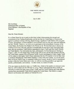 الرئيس الأميركي دونالد ترامب فرض رسوم جمركية 30% على المنتجات العراقية بسبب العجز التجاري بالوثيقة نص الرسالة من ترامب الى رئيس الوزراء العراقي