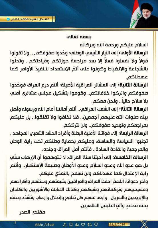 السيد الصدر يوجه 5 رسائل بشأن الأوضاع الراهنة – عراق واحد للجميع https://t.co/Q2M5q9O3cD